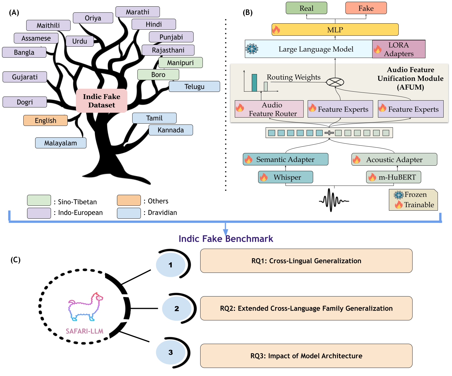 Figure 2. Overview of the IndicFake benchmark and SAFARI-LLM. The top panel shows the IndicFake dataset spanning 18 Indian languages across three language families, while the bottom panel illustrates our proposed SAFARI-LLM architecture leveraging dual speech encoders and feature fusion. Three key research questions (RQ1-3) guide our investigation of cross-lingual generalization, cross-language family transfer, and architectural impact on deepfake detection performance