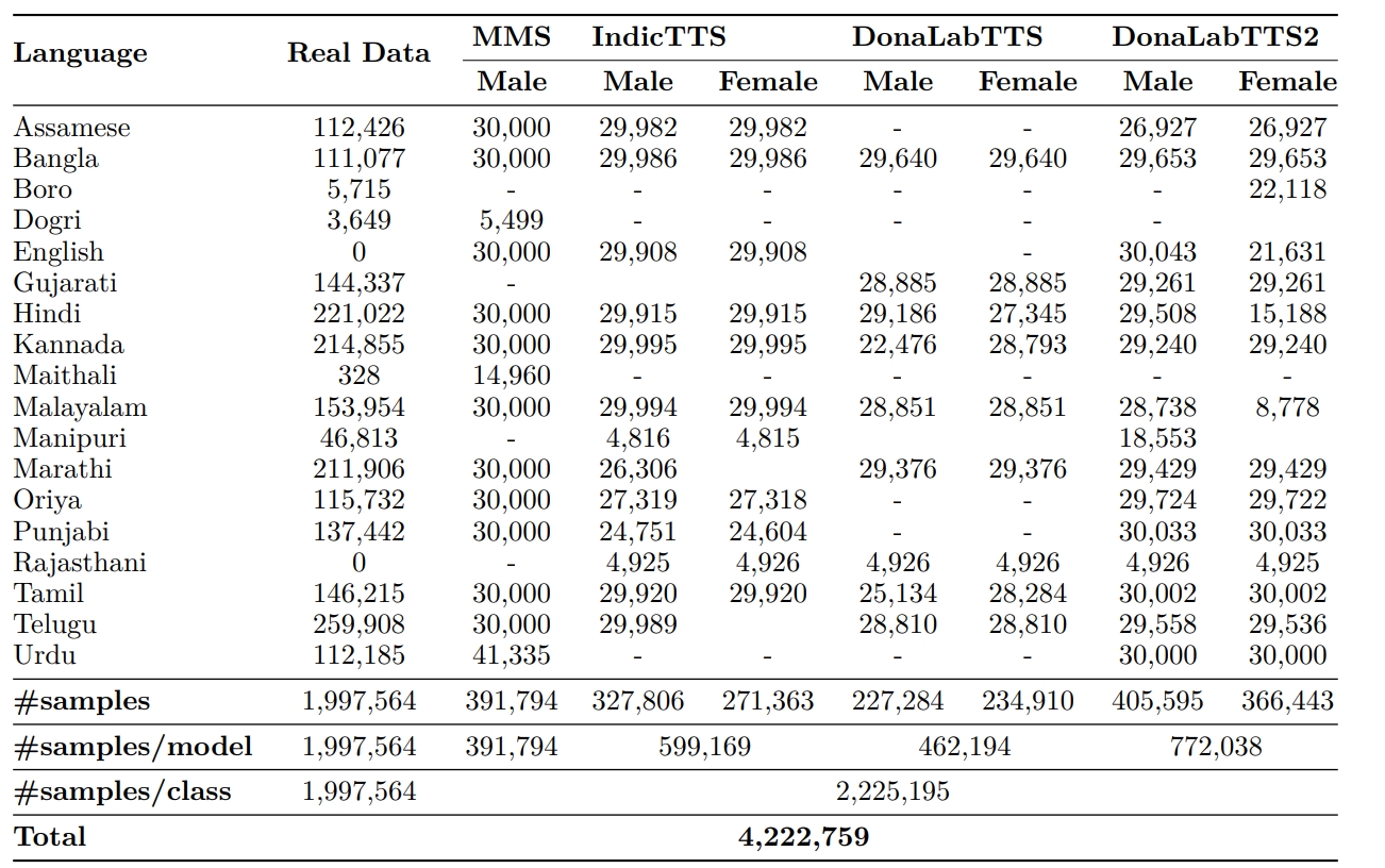 Distribution of real and synthetic speech samples across 17 Indian languages and English, showing sample counts for different TTS systems with gender-wise splits and total dataset composition.